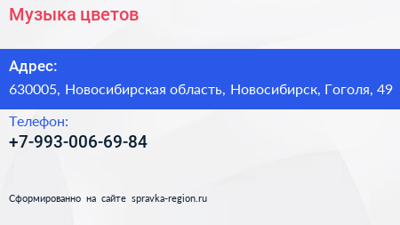 Музыка цветов по адресу 630005, Новосибирская область, Новосибирск, Гоголя, 49 в дальнейшем Организация, размещена в следующих категориях: