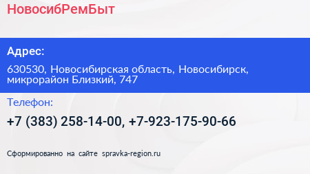 НовосибРемБыт по адресу 630530, Новосибирская область, Новосибирск, микрорайон Близкий, 747 в дальнейшем Организация, размещена в следующих категориях:
