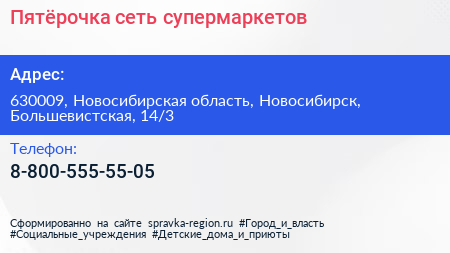 Пятёрочка, сеть супермаркетов по адресу 630009, Новосибирская область, Новосибирск, Большевистская, 14/3 в дальнейшем Организация, размещена в следующих категориях:
