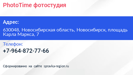 PhotoTime, фотостудия по адресу 630048, Новосибирская область, Новосибирск, площадь Карла Маркса, 7 в дальнейшем Организация, размещена в следующих категориях: