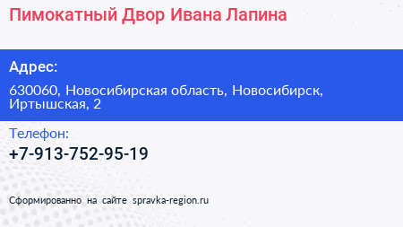 Пимокатный Двор Ивана Лапина по адресу 630060, Новосибирская область, Новосибирск, Иртышская, 2 в дальнейшем Организация, размещена в следующих категориях: