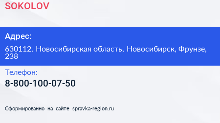 SOKOLOV по адресу 630112, Новосибирская область, Новосибирск, Фрунзе, 238 в дальнейшем Организация, размещена в следующих категориях: