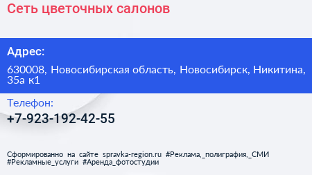 Сеть цветочных салонов по адресу 630008, Новосибирская область, Новосибирск, Никитина, 35а к1 в дальнейшем Организация, размещена в следующих категориях:
