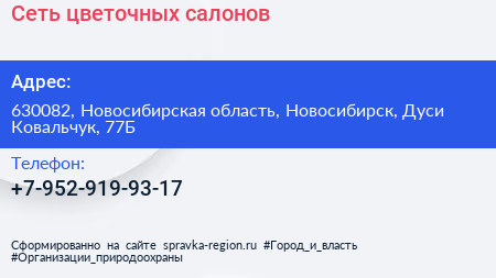 Сеть цветочных салонов по адресу 630082, Новосибирская область, Новосибирск, Дуси Ковальчук, 77Б в дальнейшем Организация, размещена в следующих категориях: