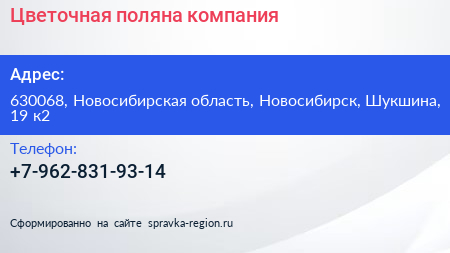 Цветочная поляна, компания по адресу 630068, Новосибирская область, Новосибирск, Шукшина, 19 к2 в дальнейшем Организация, размещена в следующих категориях: