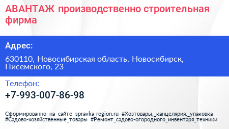 АВАНТАЖ, производственно-строительная фирма по адресу 630110, Новосибирская область, Новосибирск, Писемского, 23 в дальнейшем Организация, размещена в следующих категориях: