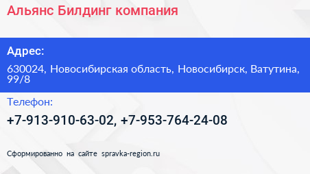 Альянс-Билдинг, компания по адресу 630024, Новосибирская область, Новосибирск, Ватутина, 99/8 в дальнейшем Организация, размещена в следующих категориях: