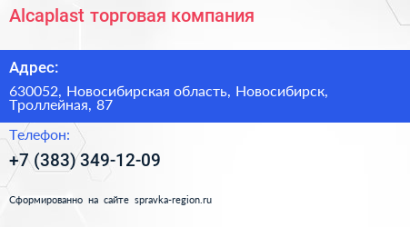 Alcaplast, торговая компания по адресу 630052, Новосибирская область, Новосибирск, Троллейная, 87 в дальнейшем Организация, размещена в следующих категориях: