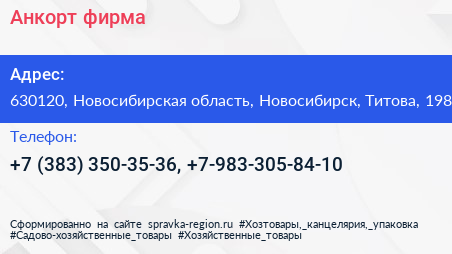 Для связи с организацией воспользуйтесь номером телефона: +7 (383) 350-35-36, +7-983-305-84-10. Пн: c 09:00-13:00, Вт: c 09:00-13:00, Ср: c 09:00-13:00, Чт: c 09:00-13:00, Пт: c 09:00-13:00, Сб: выходной, Вс: выходной, вы можете обратиться в эту организацию.