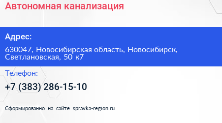 Автономная канализация по адресу 630047, Новосибирская область, Новосибирск, Светлановская, 50 к7 в дальнейшем Организация, размещена в следующих категориях: