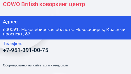 COWO British, коворкинг-центр по адресу 630091, Новосибирская область, Новосибирск, Красный проспект, 67 в дальнейшем Организация, размещена в следующих категориях: