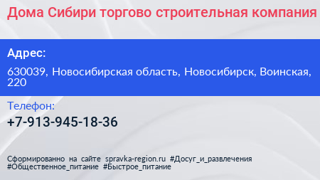 Дома Сибири, торгово-строительная компания по адресу 630039, Новосибирская область, Новосибирск, Воинская, 220 в дальнейшем Организация, размещена в следующих категориях: