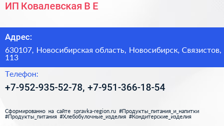 ИП Ковалевская В.Е. по адресу 630107, Новосибирская область, Новосибирск, Связистов, 113 в дальнейшем Организация, размещена в следующих категориях: