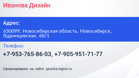 Иванова Дизайн по адресу 630099, Новосибирская область, Новосибирск, Ядринцевская, 68/1 в дальнейшем Организация, размещена в следующих категориях:
