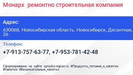 Монарх+, ремонтно-строительная компания по адресу 630068, Новосибирская область, Новосибирск, Десантная, 26 в дальнейшем Организация, размещена в следующих категориях: