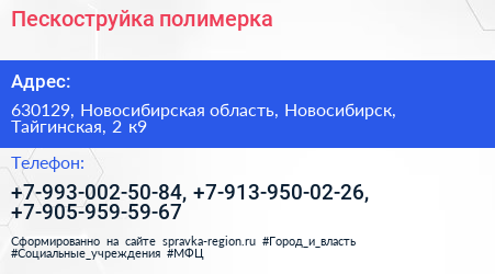 Пескоструйка полимерка по адресу 630129, Новосибирская область, Новосибирск, Тайгинская, 2 к9 в дальнейшем Организация, размещена в следующих категориях:
