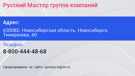 Русский Мастер, группа компаний по адресу 630082, Новосибирская область, Новосибирск, Тимирязева, 60 в дальнейшем Организация, размещена в следующих категориях:
