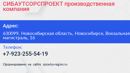 СИБАУТСОРСПРОЕКТ, производственная компания по адресу 630099, Новосибирская область, Новосибирск, Вокзальная магистраль, 16 в дальнейшем Организация, размещена в следующих категориях: