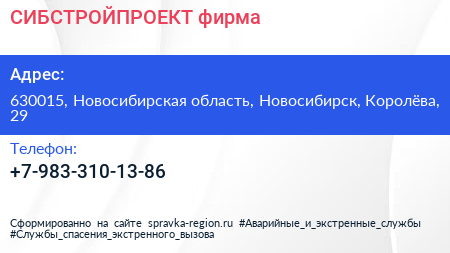 СИБСТРОЙПРОЕКТ, фирма по адресу 630015, Новосибирская область, Новосибирск, Королёва, 29 в дальнейшем Организация, размещена в следующих категориях: