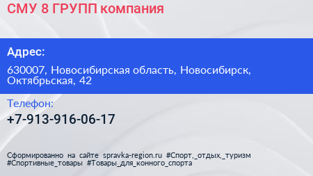 СМУ 8 ГРУПП, компания по адресу 630007, Новосибирская область, Новосибирск, Октябрьская, 42 в дальнейшем Организация, размещена в следующих категориях: