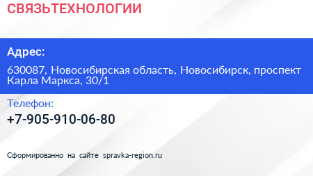 СВЯЗЬТЕХНОЛОГИИ по адресу 630087, Новосибирская область, Новосибирск, проспект Карла Маркса, 30/1 в дальнейшем Организация, размещена в следующих категориях: