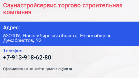 Саунастройсервис, торгово-строительная компания по адресу 630009, Новосибирская область, Новосибирск, Декабристов, 92 в дальнейшем Организация, размещена в следующих категориях:
