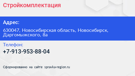 Стройкомплектация по адресу 630047, Новосибирская область, Новосибирск, Даргомыжского, 8а в дальнейшем Организация, размещена в следующих категориях: