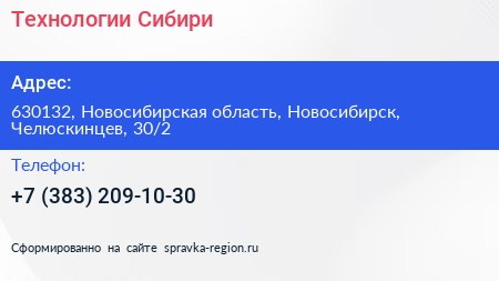 Технологии Сибири по адресу 630132, Новосибирская область, Новосибирск, Челюскинцев, 30/2 в дальнейшем Организация, размещена в следующих категориях: