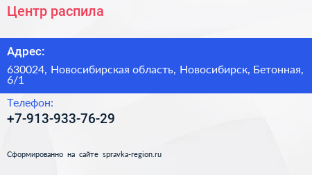 Центр распила по адресу 630024, Новосибирская область, Новосибирск, Бетонная, 6/1 в дальнейшем Организация, размещена в следующих категориях: