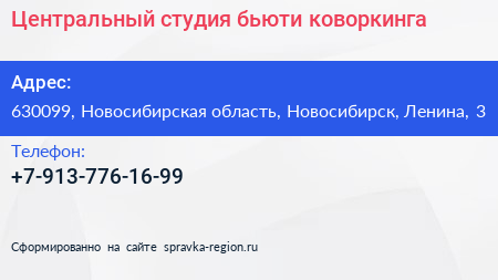 Центральный, студия бьюти-коворкинга по адресу 630099, Новосибирская область, Новосибирск, Ленина, 3 в дальнейшем Организация, размещена в следующих категориях: