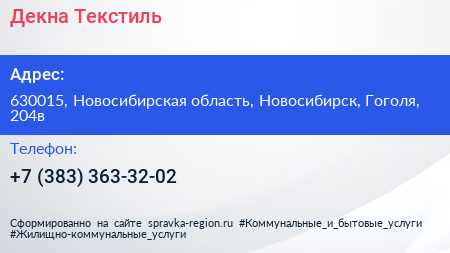Декна Текстиль по адресу 630015, Новосибирская область, Новосибирск, Гоголя, 204в в дальнейшем Организация, размещена в следующих категориях: