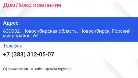 ДомЛюкс, компания по адресу 630032, Новосибирская область, Новосибирск, Горский микрорайон, 64 в дальнейшем Организация, размещена в следующих категориях: