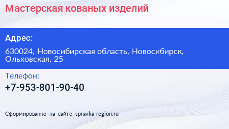 Мастерская кованых изделий по адресу 630024, Новосибирская область, Новосибирск, Ольховская, 25 в дальнейшем Организация, размещена в следующих категориях: