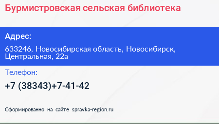 Бурмистровская сельская библиотека по адресу 633246, Новосибирская область, Новосибирск, Центральная, 22а в дальнейшем Организация, размещена в следующих категориях: