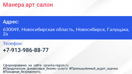Манера, арт-салон по адресу 630049, Новосибирская область, Новосибирск, Галущака, 2а в дальнейшем Организация, размещена в следующих категориях: