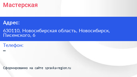 Мастерская по адресу 630110, Новосибирская область, Новосибирск, Писемского, 6 в дальнейшем Организация, размещена в следующих категориях: