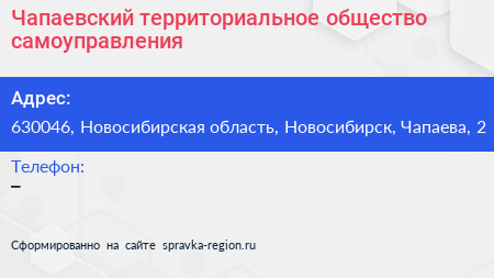 Чапаевский, территориальное общество самоуправления по адресу 630046, Новосибирская область, Новосибирск, Чапаева, 2 в дальнейшем Организация, размещена в следующих категориях: