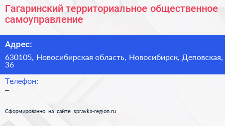 Гагаринский, территориальное общественное самоуправление по адресу 630105, Новосибирская область, Новосибирск, Деповская, 36 в дальнейшем Организация, размещена в следующих категориях: