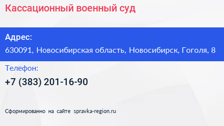 Кассационный военный суд по адресу 630091, Новосибирская область, Новосибирск, Гоголя, 8 в дальнейшем Организация, размещена в следующих категориях: