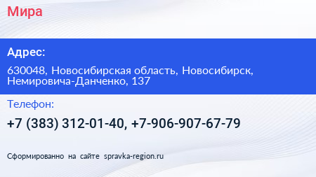 Мира по адресу 630048, Новосибирская область, Новосибирск, Немировича-Данченко, 137 в дальнейшем Организация, размещена в следующих категориях: