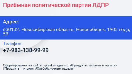 Приёмная политической партии ЛДПР по адресу 630132, Новосибирская область, Новосибирск, 1905 года, 59 в дальнейшем Организация, размещена в следующих категориях: