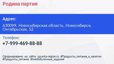 Родина, партия по адресу 630099, Новосибирская область, Новосибирск, Октябрьская, 52 в дальнейшем Организация, размещена в следующих категориях:
