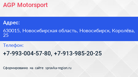 AGP Motorsport по адресу 630015, Новосибирская область, Новосибирск, Королёва, 25 в дальнейшем Организация, размещена в следующих категориях: