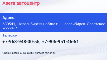 Авега, автоцентр по адресу 630541, Новосибирская область, Новосибирск, Советское шоссе, 7 в дальнейшем Организация, размещена в следующих категориях: