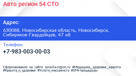 Авто-регион 54, СТО по адресу 630088, Новосибирская область, Новосибирск, Сибиряков-Гвардейцев, 47 к8 в дальнейшем Организация, размещена в следующих категориях: