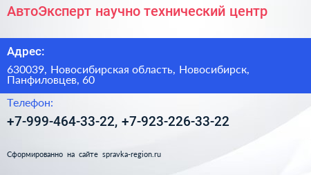 АвтоЭксперт, научно-технический центр по адресу 630039, Новосибирская область, Новосибирск, Панфиловцев, 60 в дальнейшем Организация, размещена в следующих категориях: