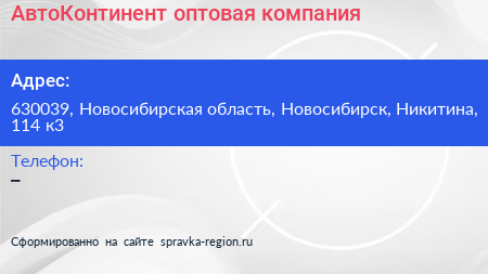 АвтоКонтинент, оптовая компания по адресу 630039, Новосибирская область, Новосибирск, Никитина, 114 к3 в дальнейшем Организация, размещена в следующих категориях: