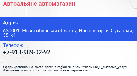 Автоальянс, автомагазин по адресу 630001, Новосибирская область, Новосибирск, Сухарная, 35 к4 в дальнейшем Организация, размещена в следующих категориях: