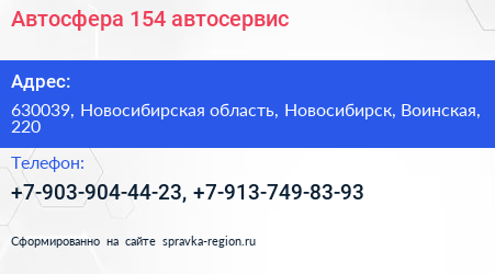 Автосфера 154, автосервис по адресу 630039, Новосибирская область, Новосибирск, Воинская, 220 в дальнейшем Организация, размещена в следующих категориях: