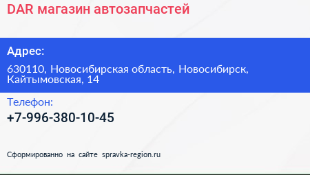 DAR, магазин автозапчастей по адресу 630110, Новосибирская область, Новосибирск, Кайтымовская, 14 в дальнейшем Организация, размещена в следующих категориях: